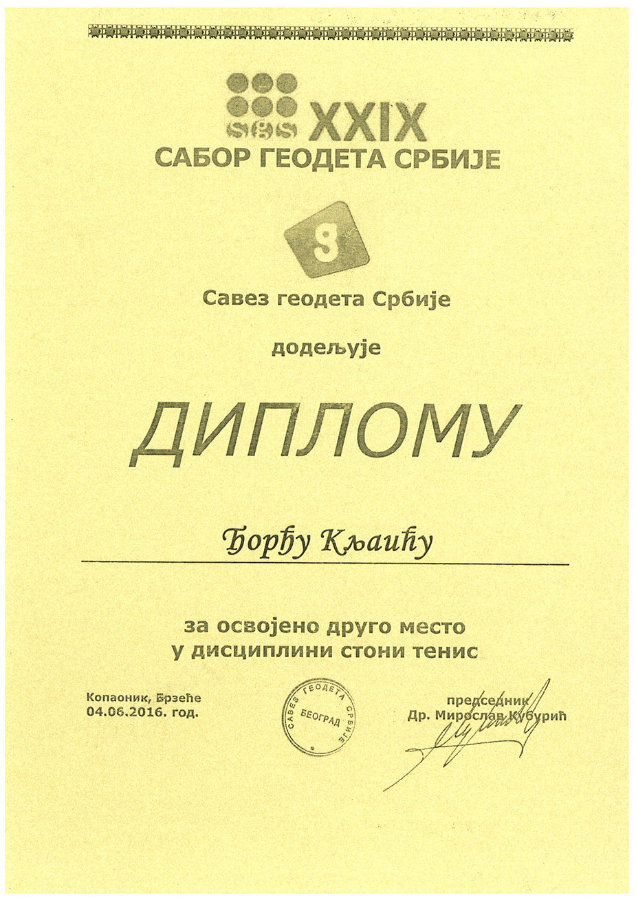 Запажен резултат у спортском делу 29. Сабора геодета Србије остварио је колега Ђорђе Кљаић освајањем 2. места на такмичењу у стоном тенису.