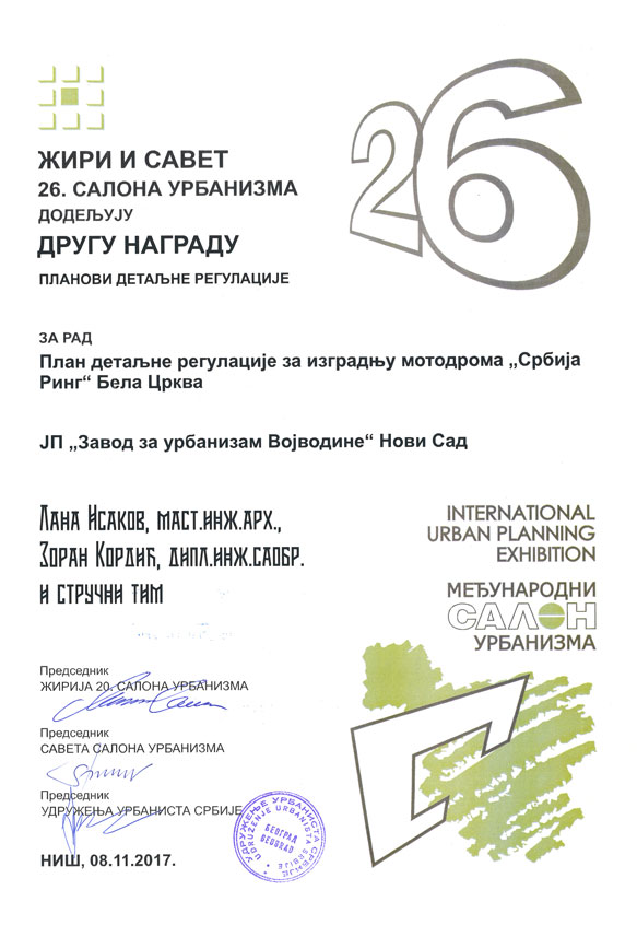 Другу награду у категорији „Планови детаљне регулације“ савет и жири Салона доделио је за рад „План детаљне регулације за изградњу мотодрома „Србија Ринг“ Бела Црква“.