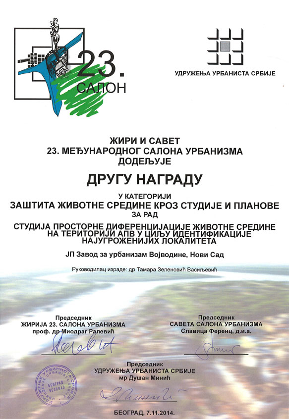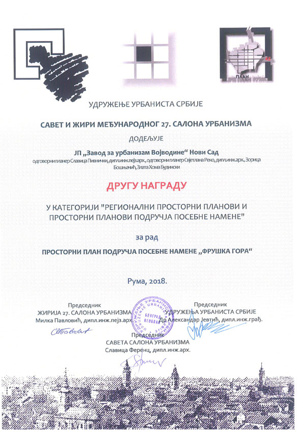 Прва награда у категорији регионални планови, додељена је ЈП Заводу за урбанизам Војводине, за рад: