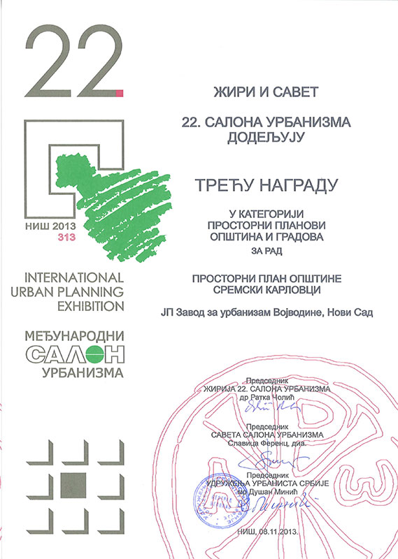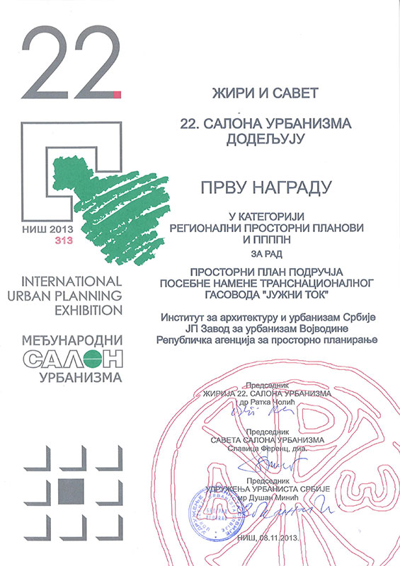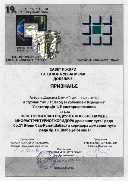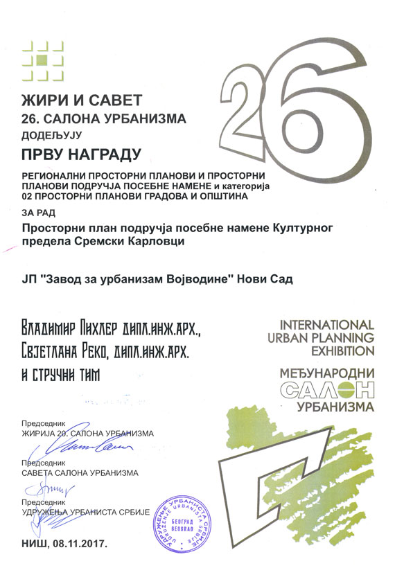 Прва награда у категорији просторни планови и ППППН додељена је Институту за архитектуру и урбанизам Србије, ЈП Завод за урбанизам Војводине и Републичкој агенцији за просторно планирање за рад: