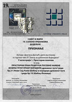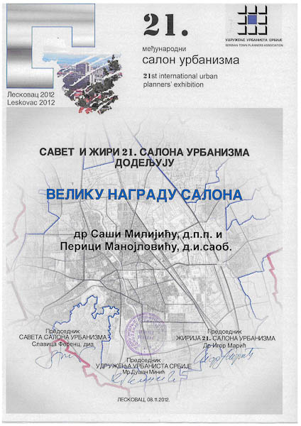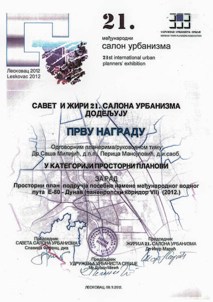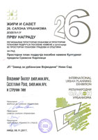 Прва награда у категорији просторни планови додељена је одговорним планерима/руководном тиму др Саша Милијић д.п.п. и Перица Манојловић д.и.саоб., за рад: