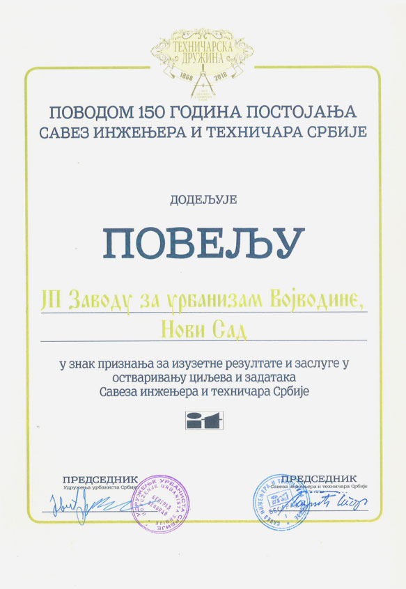 Поводом 150 година постојања Савеза доделио је Повељу ЈП "Завод за урбанизам Војводине"
