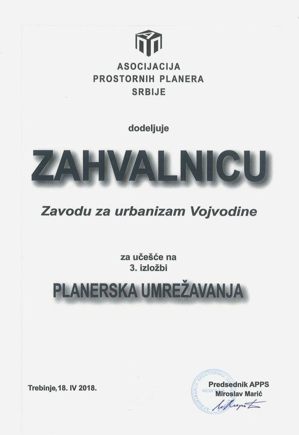 Асоцијација просторних планера Србије додељује Захвалницу ЈП "Завод за урбанизам Војводине"