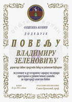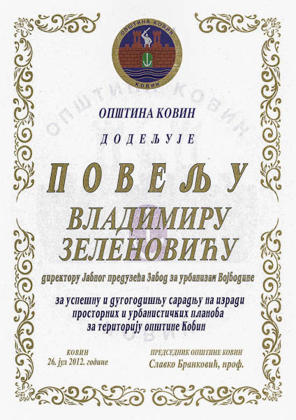 Владимиру Зеленовићу, за успешну и дугогодишњу сарадњу на изради просторних и урбанистичких планова за територију општине Ковин