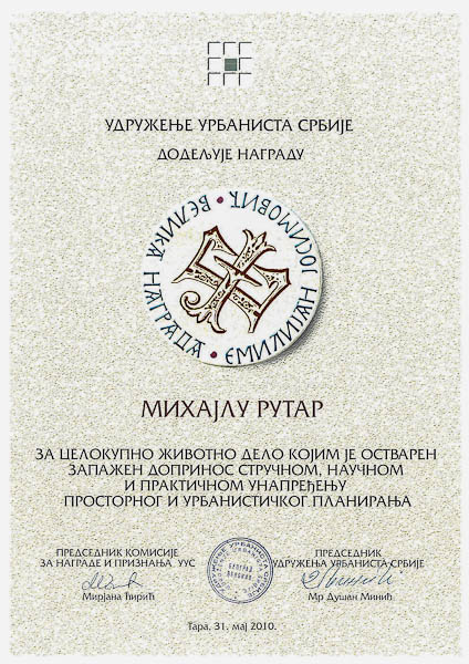Награда за целокупно животно дело којим је остварен запажен допринос стручном, научном и практичном унапређењу просторног и урбанистичког планирања, додељена је: