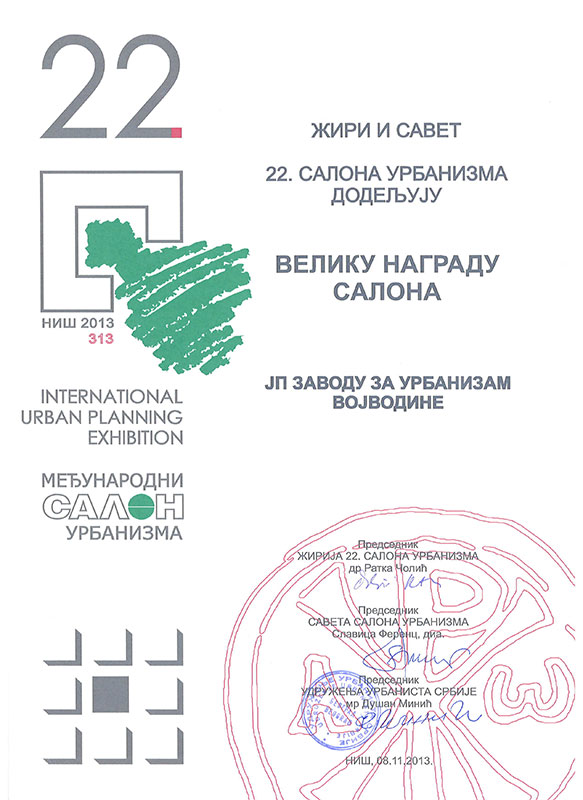 Савет и жири 22. салона урбанизма додељују ВЕЛИКУ НАГРАДУ САЛОНА ЈП Завод за урбанизам Војводине