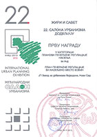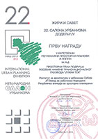 Прва награда у категорији 3. планови генералне регулације, додељена је Весни Просеници д.и.а и Људмили Јамушаков д.и.а., за рад: