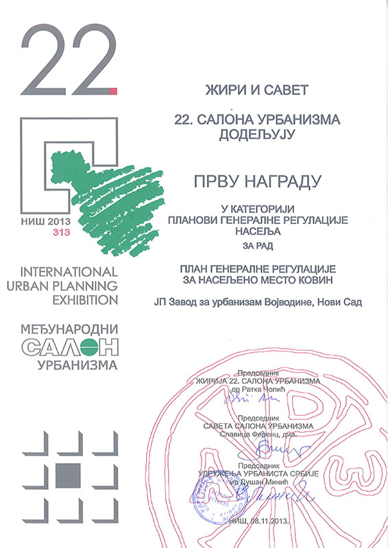 Прва награда у категорији планови генералне регулације насеља додељена је ЈП Завод за урбанизам Војводине за рад: