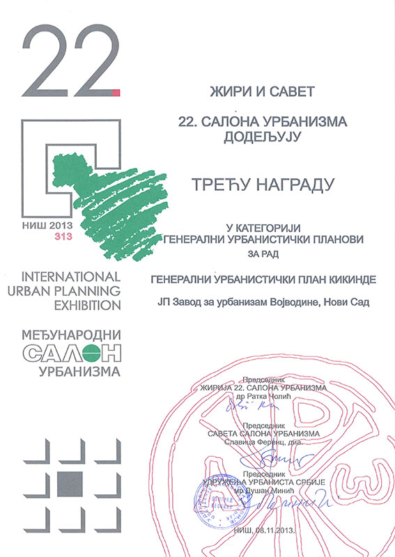 Трећа награда у категорији генерални урбанистички планови додељена је ЈП Завод за урбанизам Војводине за рад: